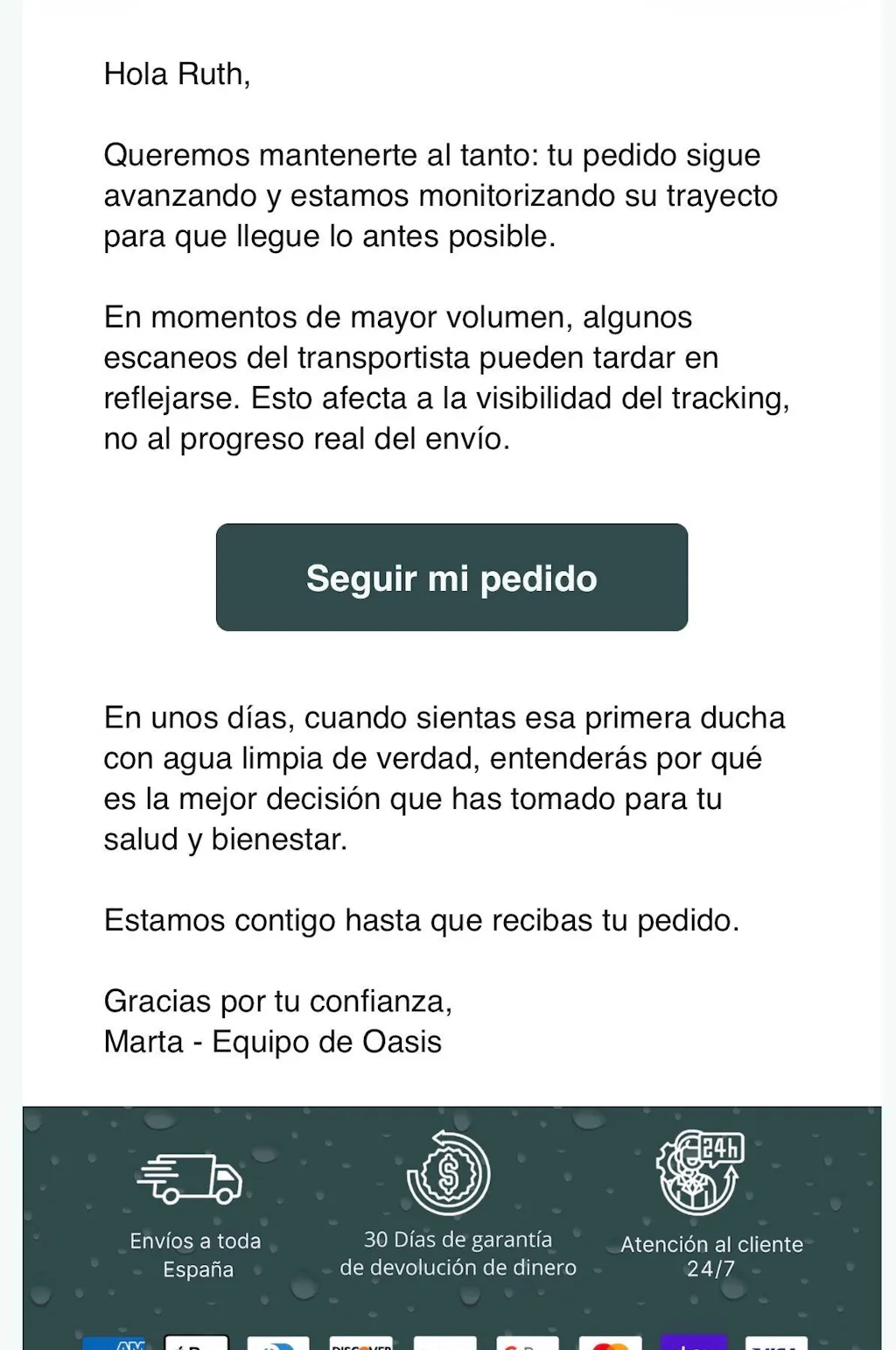 Llevo casi 6 meses encantada con mi Oasis; me ha ayudado muchísimo con la la caspa. Vivo en una ciudad con agua dura y tenía el cuero cabelludo súper irritado y descamado. Tuve que contactar con atención al cliente para saber como influye el agua dura con la caspa y me explicaron en minutos todo lo que necesitaba. Estoy completamente satisfecha con el producto y su servicio de atención al cliente, y lo recomiendo a todo el mundo. Los adoro y a su equipo. Me han salvado ♥