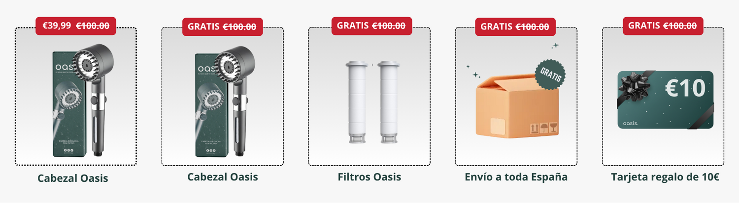 Desarrollada por el Dr. Robert Campos Oasis a diferencia de otras marcas incorpora un sistema único de filtración de 3 etapas que elimina lo que los demás no pueden: cal, cloro, metales pesados, óxidos, microplásticos y otros tóxicos del agua. ¿El resultado? Agua limpia y pura que le devolverá el brillo y la suavidad a tu piel y pelo que ningún producto de belleza ha conseguido en años.